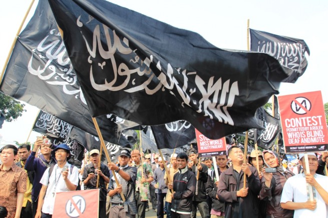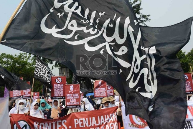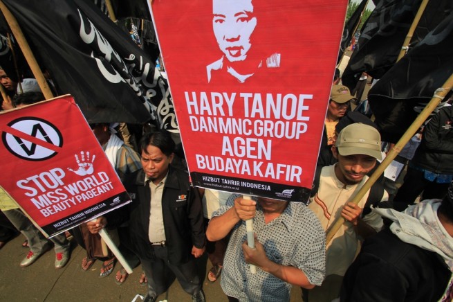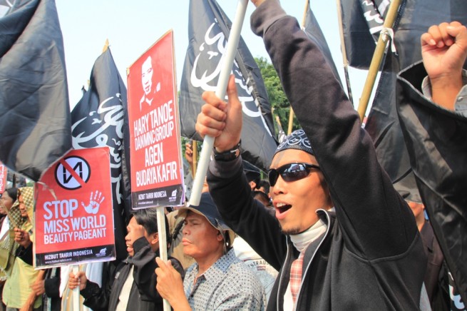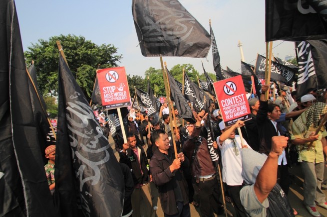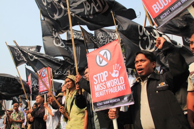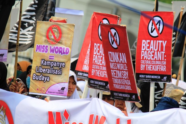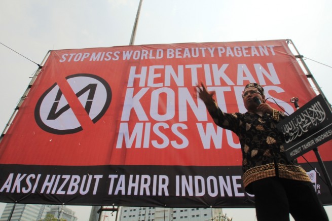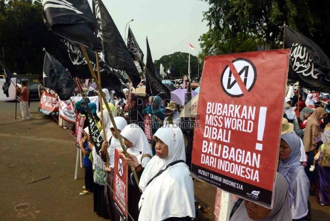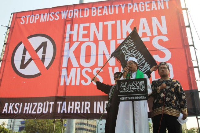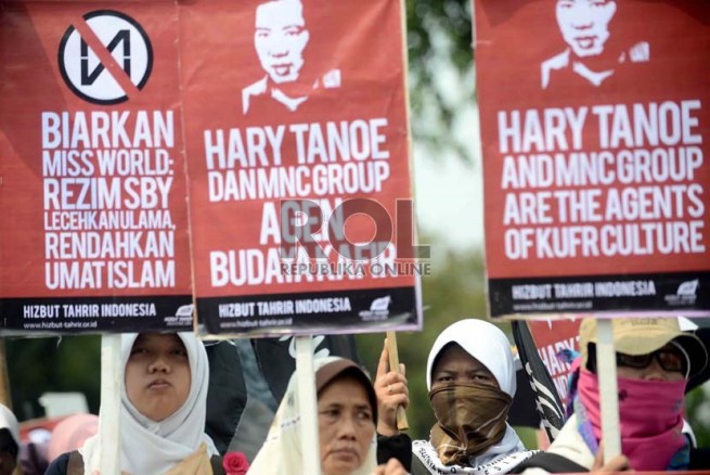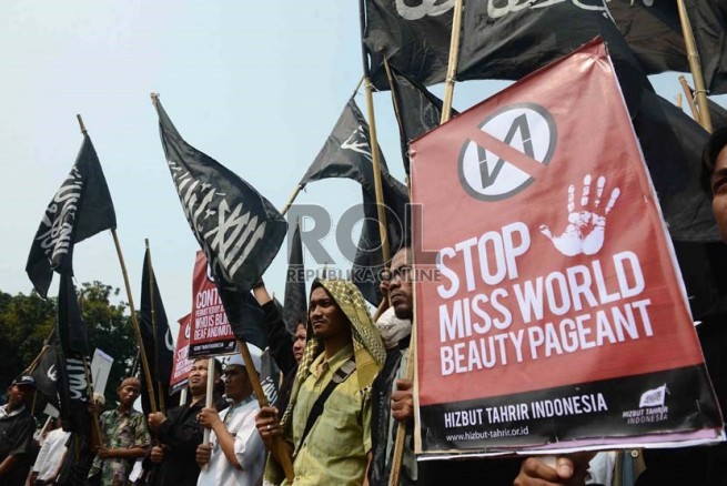 Jakarta- Hari Senin Kemarin (09/09), Hizbut Tahrir Indonesia (HTI) kembali menggelar aksi menolak Miss World di Depan Istana Presiden, Medan, Jakarta. Aksi yang diikuti ratusan massa yang terdiri dari aktivis HTI dan umat Islam ini membentangkan poster yang berisi menolak kontes Miss World.