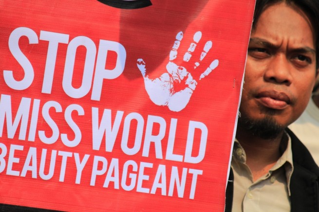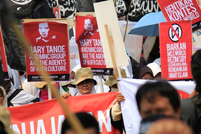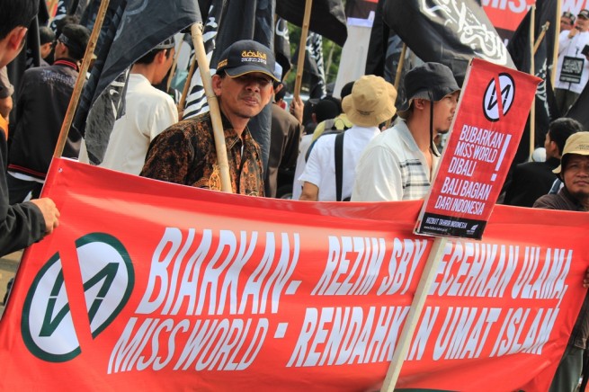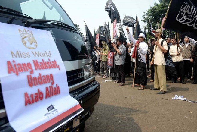 "Biarkan Miss World: Rezim SBY Lecehkan Ulama, Rendahkan Umat Islam". " Hary TAnoe And MNC Group Are The Agents Of Kufr Culture". " Stop Miss World Beauty Pageant". " Bubarkan Miss WOrld di BAli, Bali Bagian Dari Indonesia". "Miss World Ajang Maksiat Mengundang Adzab Alloh". dll, demikian isi poster yang dibentangkan oleh peserta aksi.