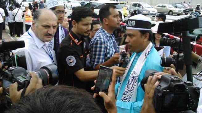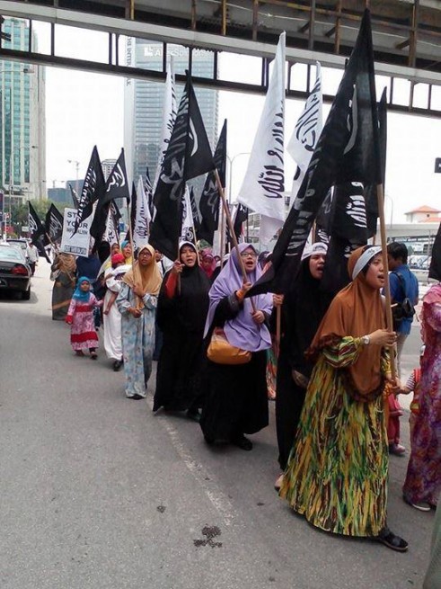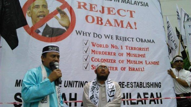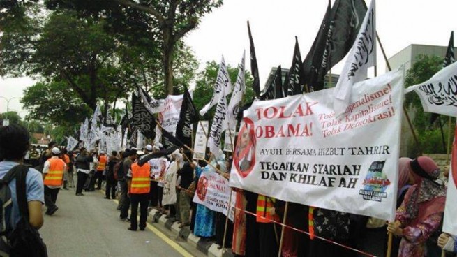 Home > politik > HT Malaysia melakukan aksi tolak kedatangan Obama berita internasional HT Malaysia politik HT Malaysia melakukan aksi tolak kedatangan Obama [FOTO] Aksi HT Malaysia Tolak Obama Selepas salat Jum’at kemarin(18/4), HT Malaysia melakukan aksi damai di depan kedutaan Amerika Serikat untuk menolak kedatangan Presiden AS yaitu si Pembunuh Umat Islam Barrack Obama.() hti press/ syabab indonesia 06.25.00 berita internasional HT Malaysia politik